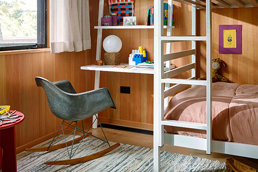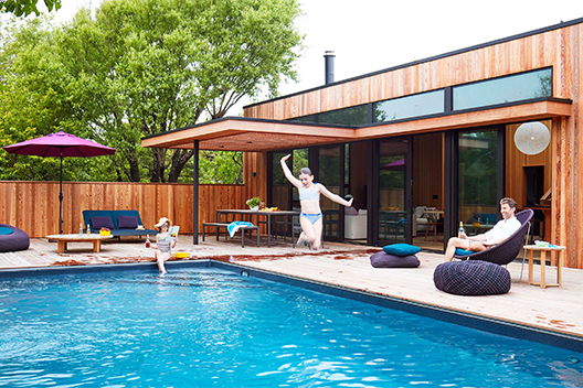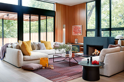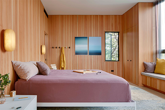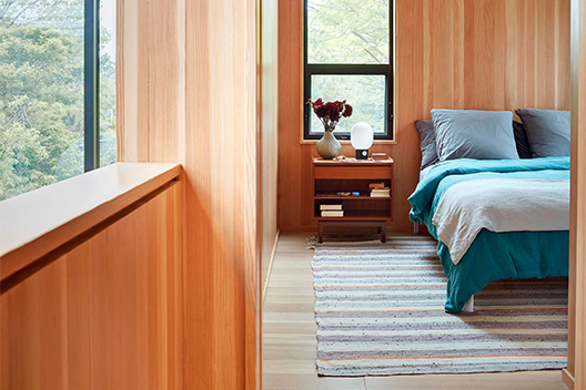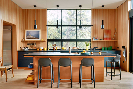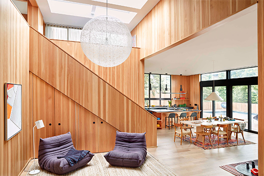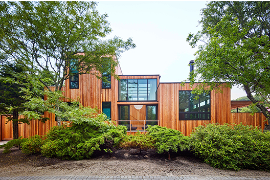 This beautiful home is nestled in the trees of Fire Island and features center-match fir wall paneling, wood flooring, custom cabinetry, black trim windows and doors, and tongue and groove cedar siding.