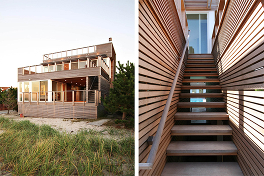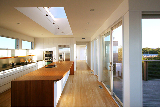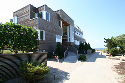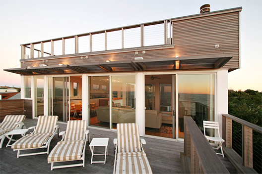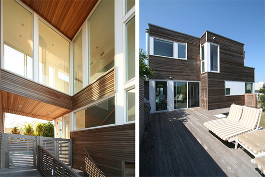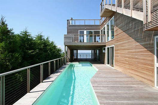 This bay-front home features horizontal clear cedar siding, upper and lower exterior decks, swimming pool, outdoor shower, cable railings, custom kitchen cabinetry, teak and granite kitchen countertops.